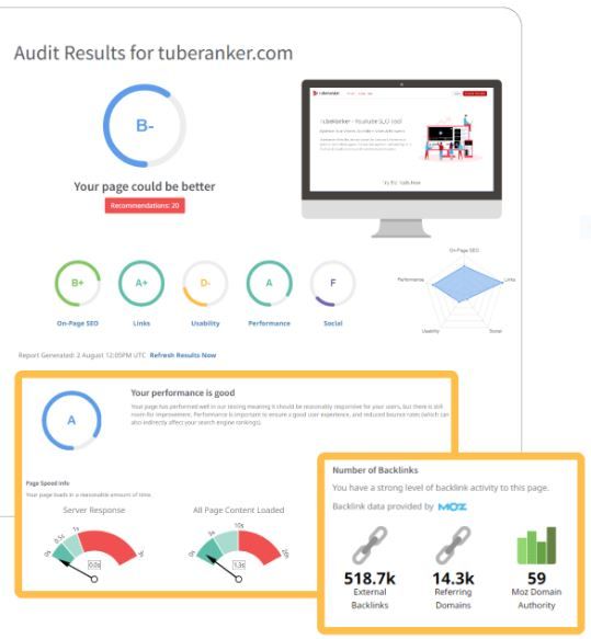 This report grades your website on the strength of a range of important factors such as on-page SEO optimization, off-page backlinks, social, performance, security and more.