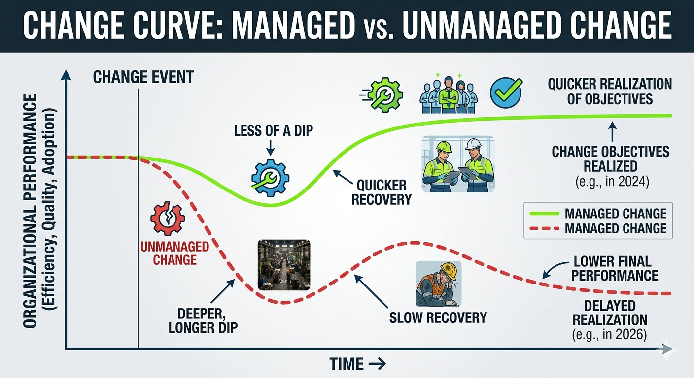 Every week a change initiative runs without a structured adoption plan is another week of workarounds becoming permanent. Another week of the floor doing it the old way. Another week of ROI that won't be recovered.